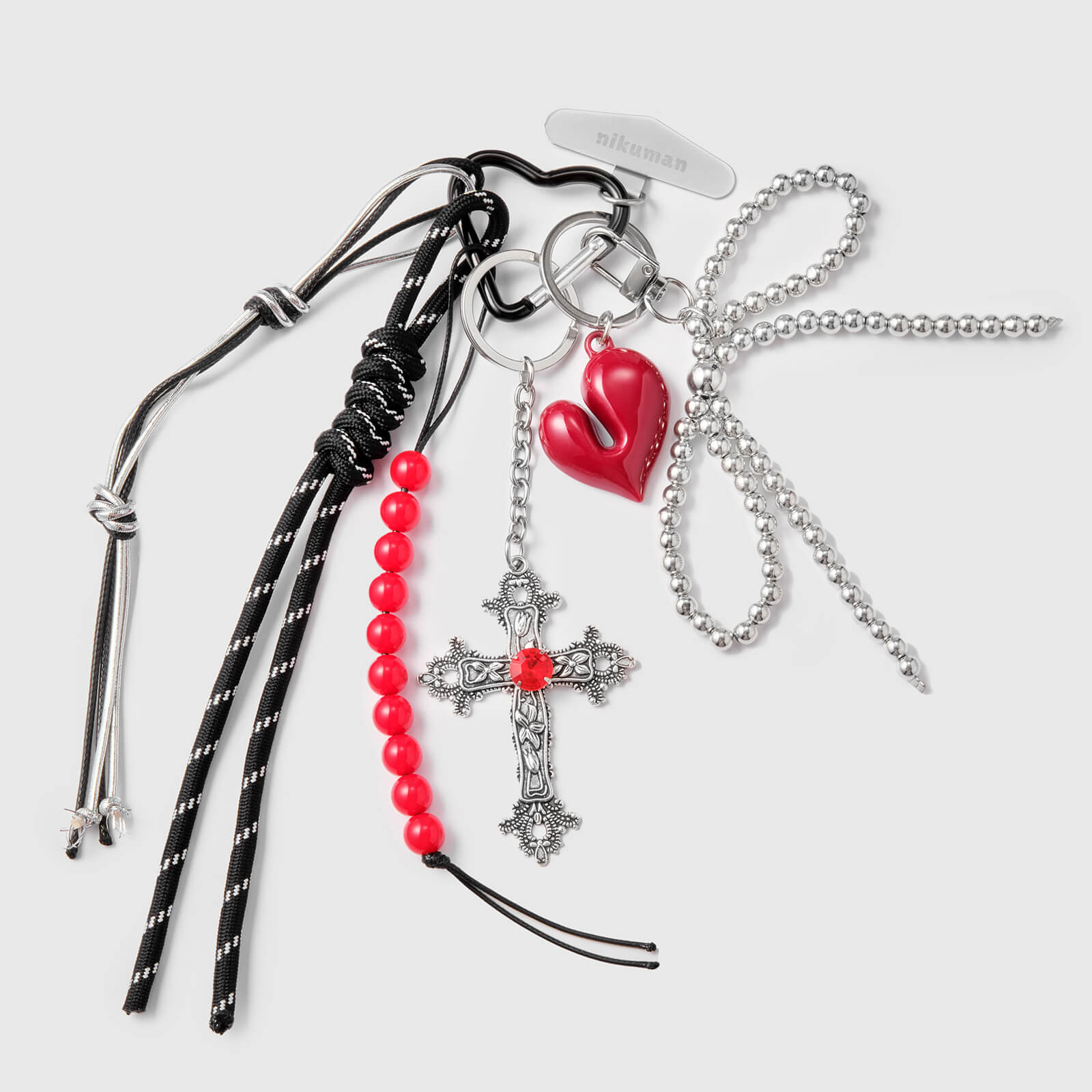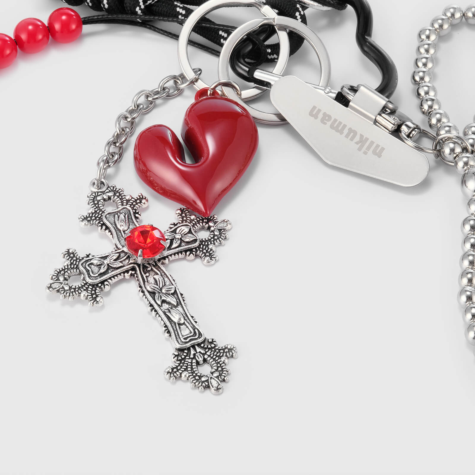 A statement piece where passion meets edge. ThIs charm blends a bold red heart, a gem-encrusted cross, and shimmering metallic beads on braided ropes. Perfect for spicing up cell phone or bag, it’s a conversation starter for those who dare to stand out.