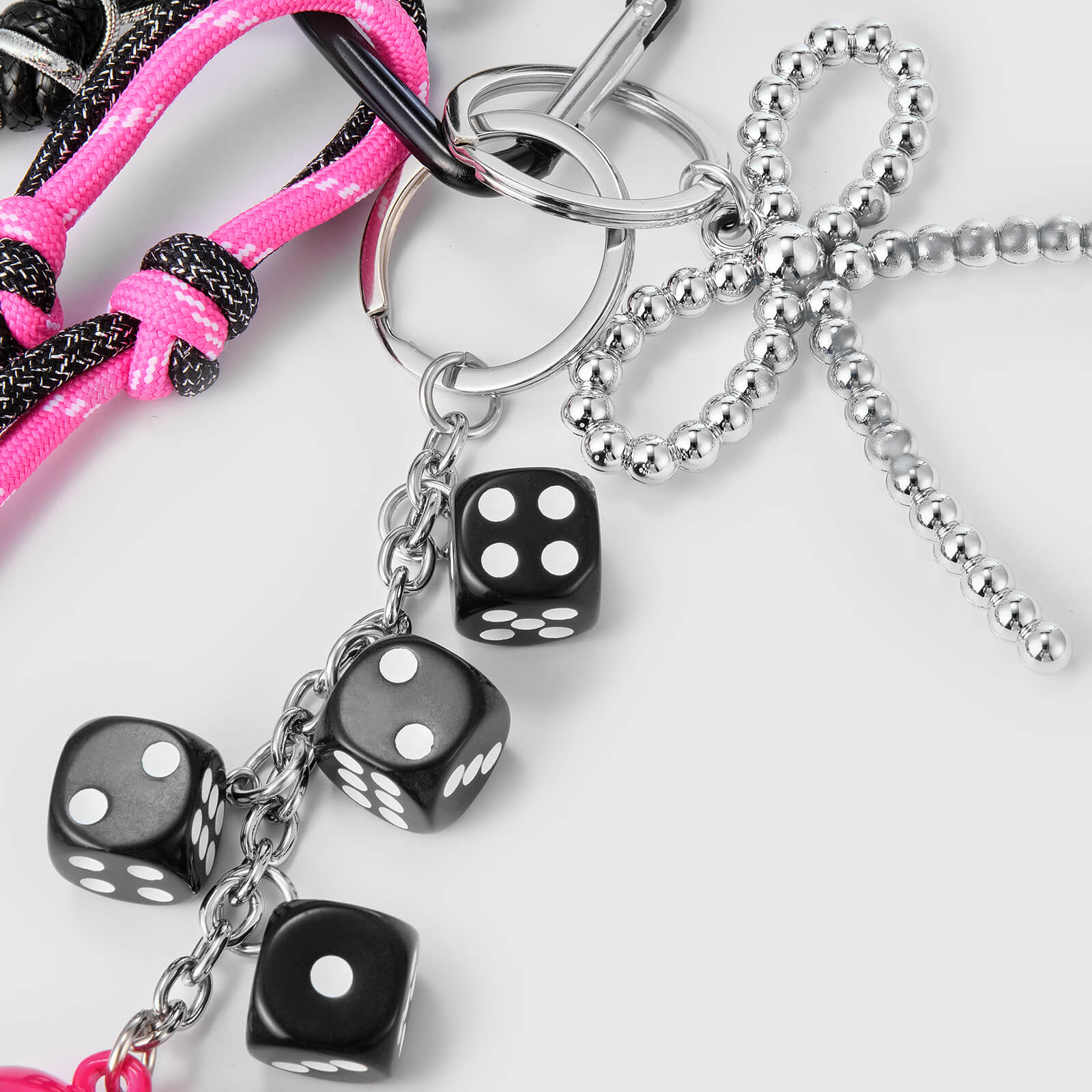 The charm blends bold contrast and whimsical details—black-pink braided knots, metallic chains, dice charms, and a heart pendant—for tech accessories that thrill wanderers and style rebels alike.
