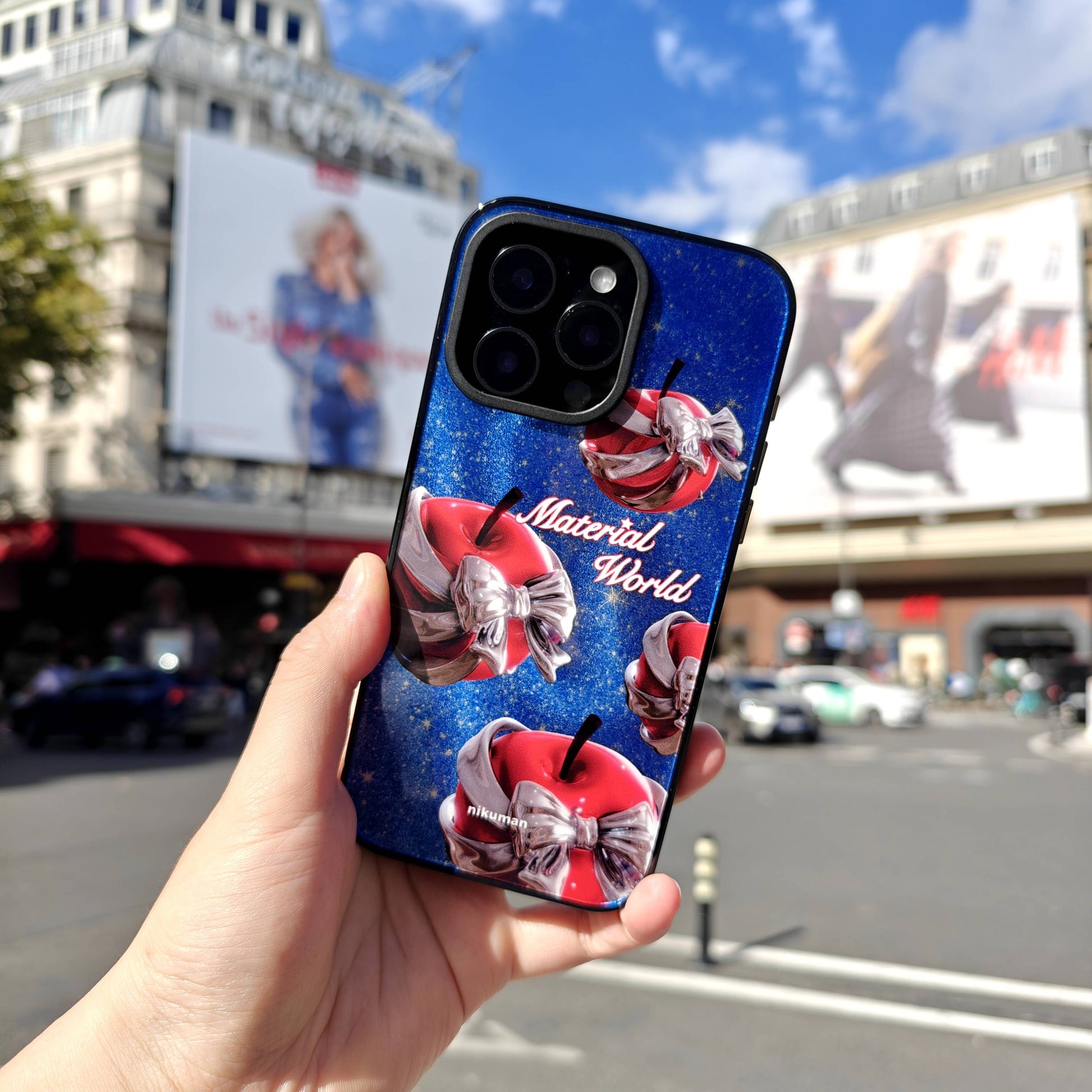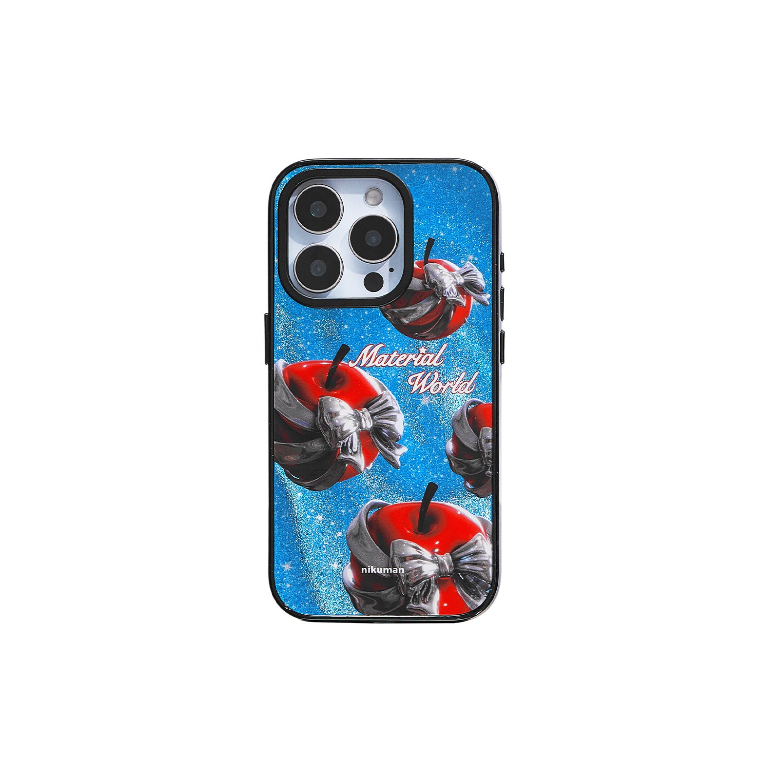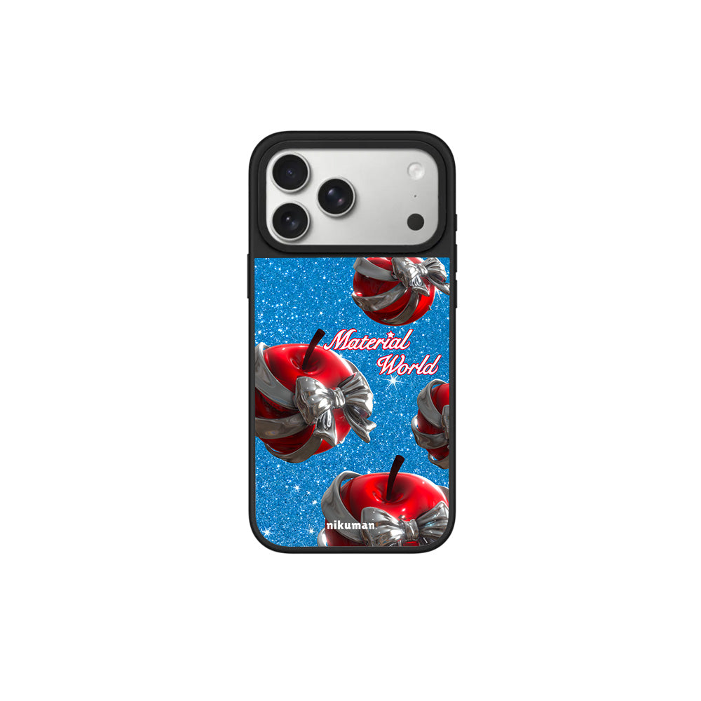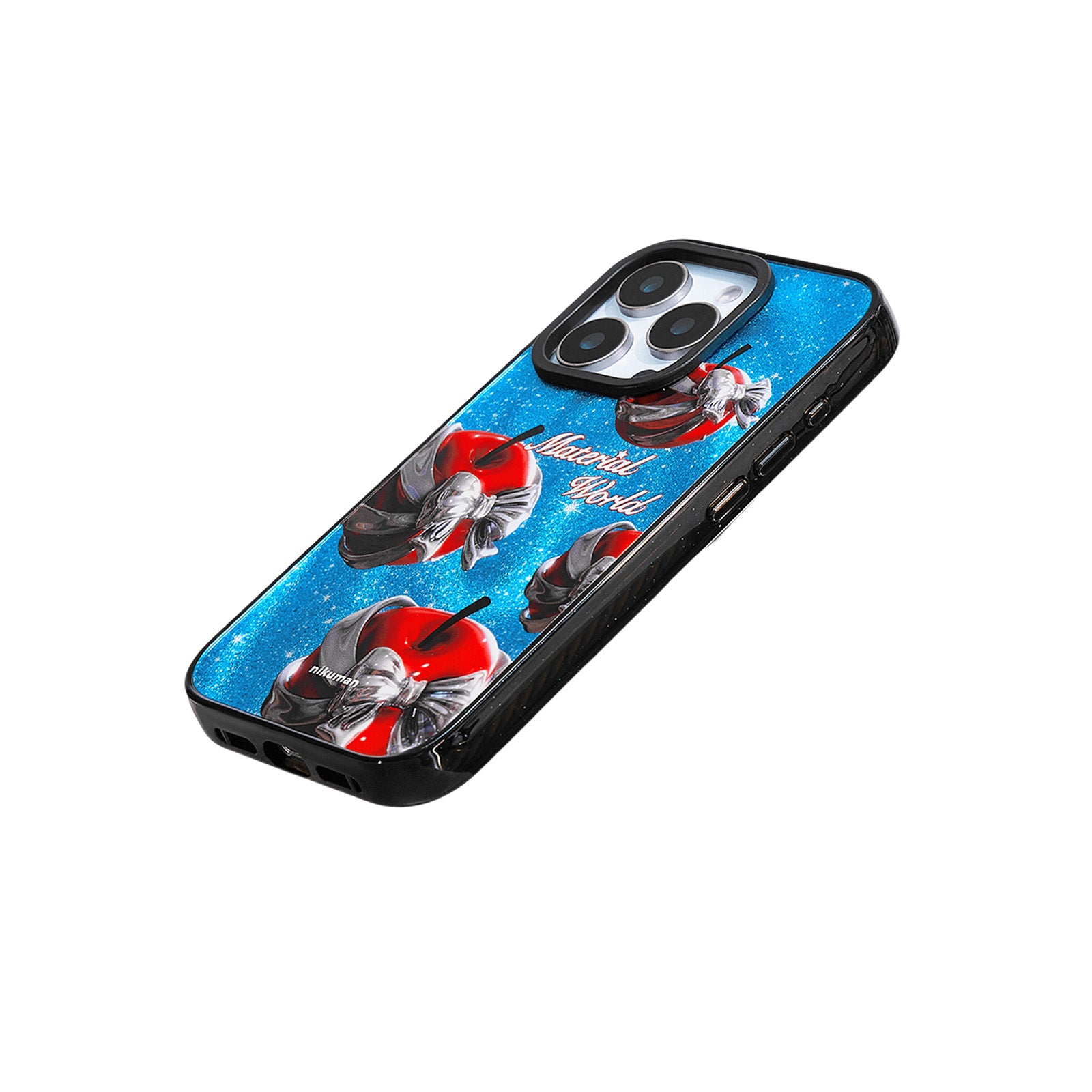 Step into a Material World where 1980s nostalgia collides with 2030s glam. The case features a vivid blue backdrop, playful red apples, and silver bows, wrapped in military-grade drop protection. For rebels who crave style that bites back.