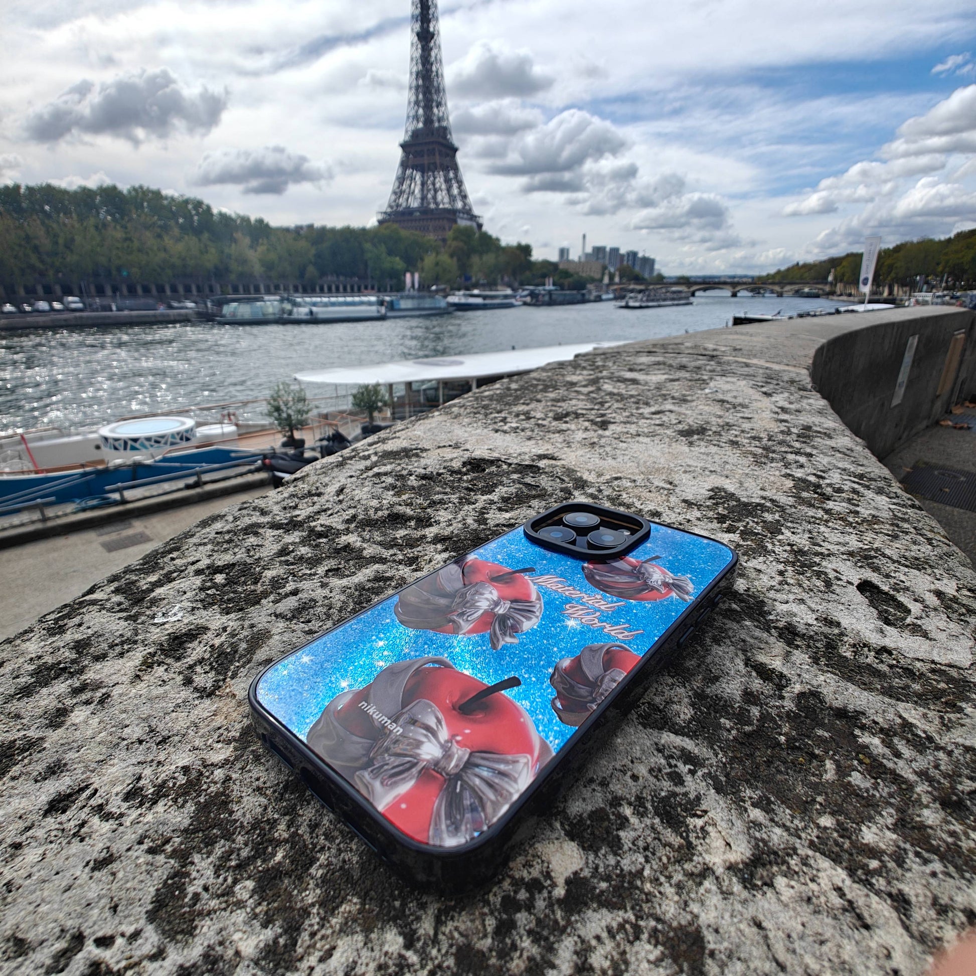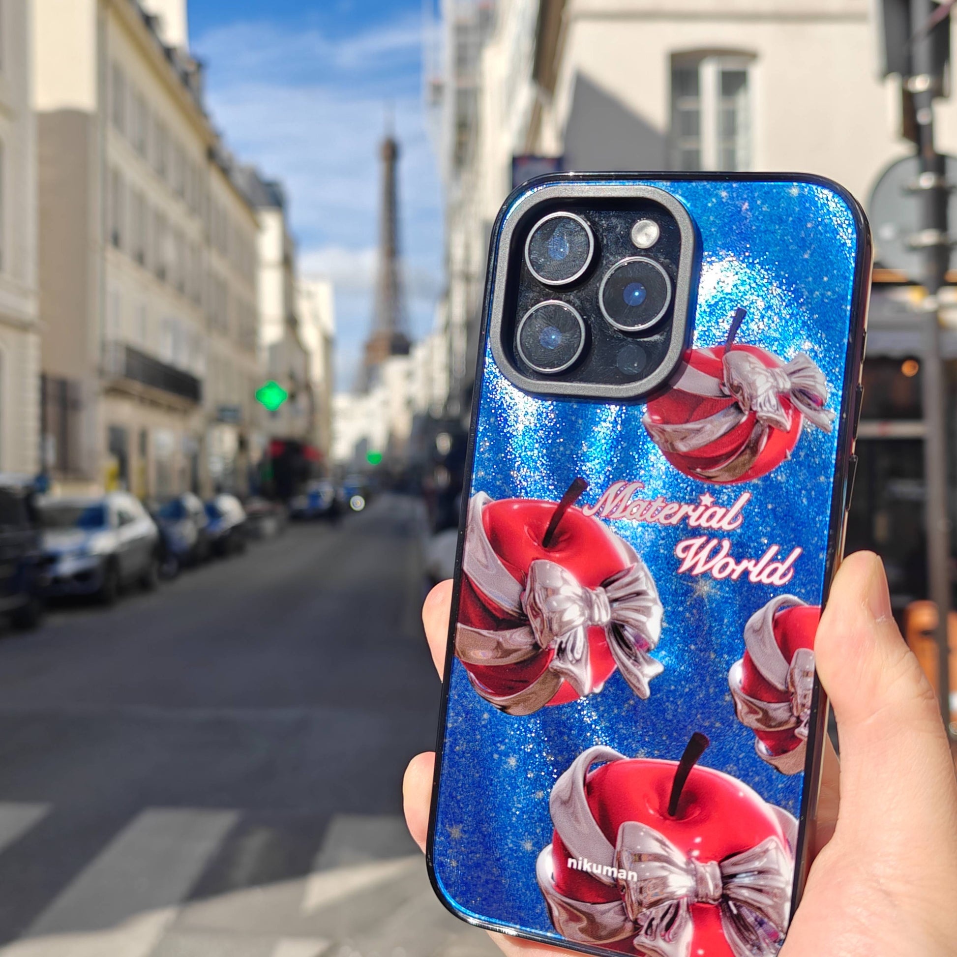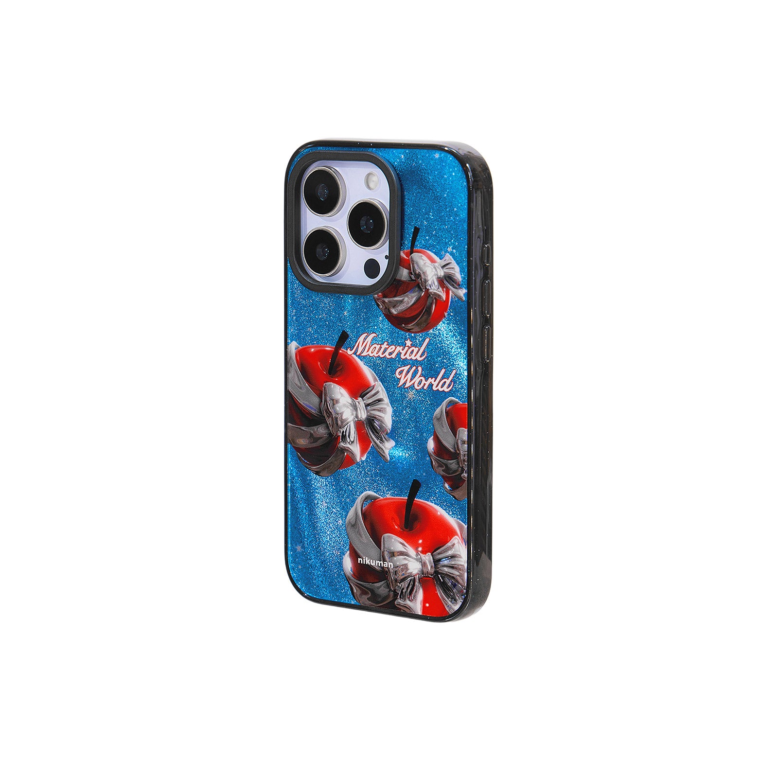Step into a Material World where 1980s nostalgia collides with 2030s glam. The case features a vivid blue backdrop, playful red apples, and silver bows, wrapped in military-grade drop protection. For rebels who crave style that bites back.