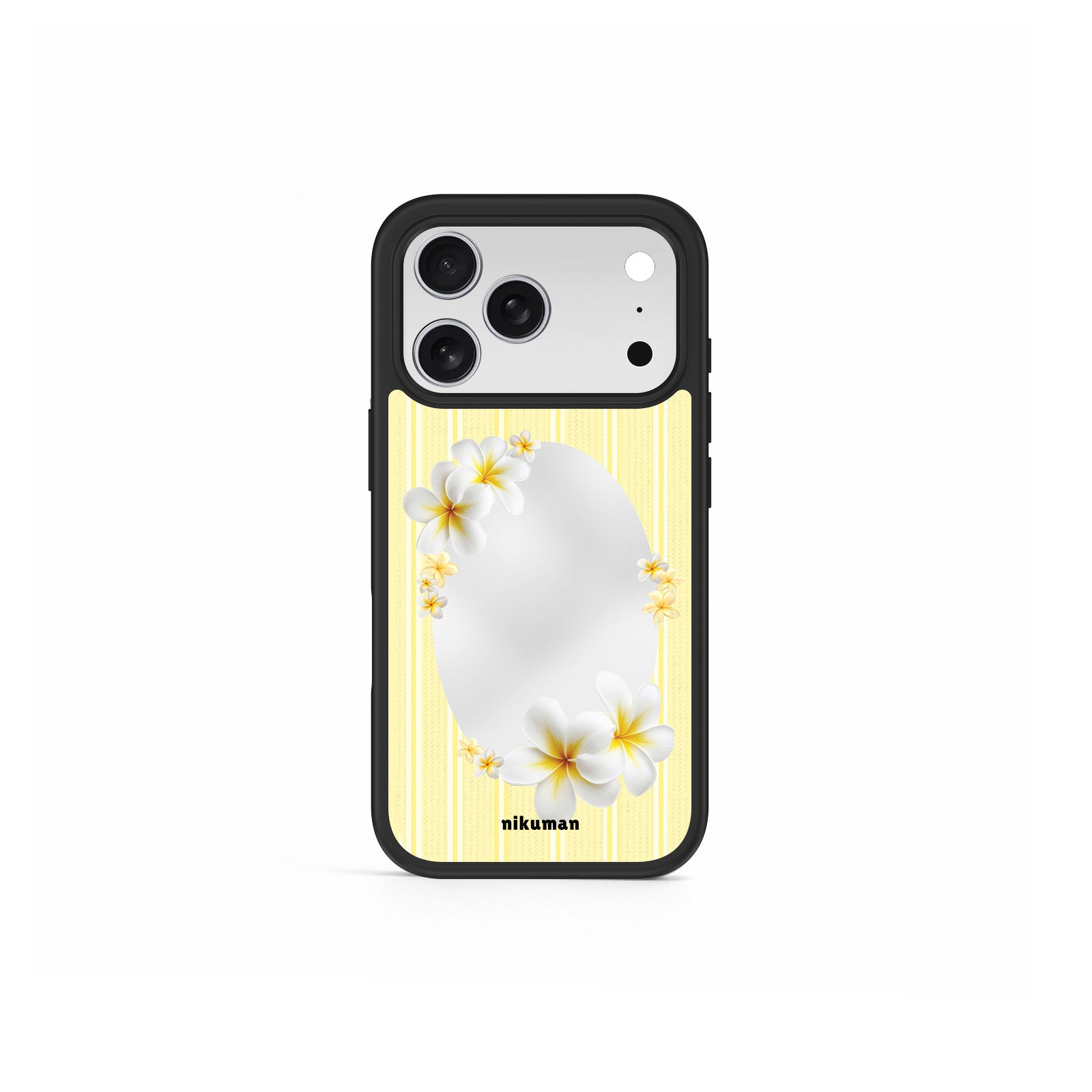 Wrap your phone in the soft embrace of the mirror case, where delicate white frangipani blooms dance on a buttery striped backdrop. The oval mirror adds a dash of practicality, while MagSafe compatibility keeps it effortlessly stylish and functional.