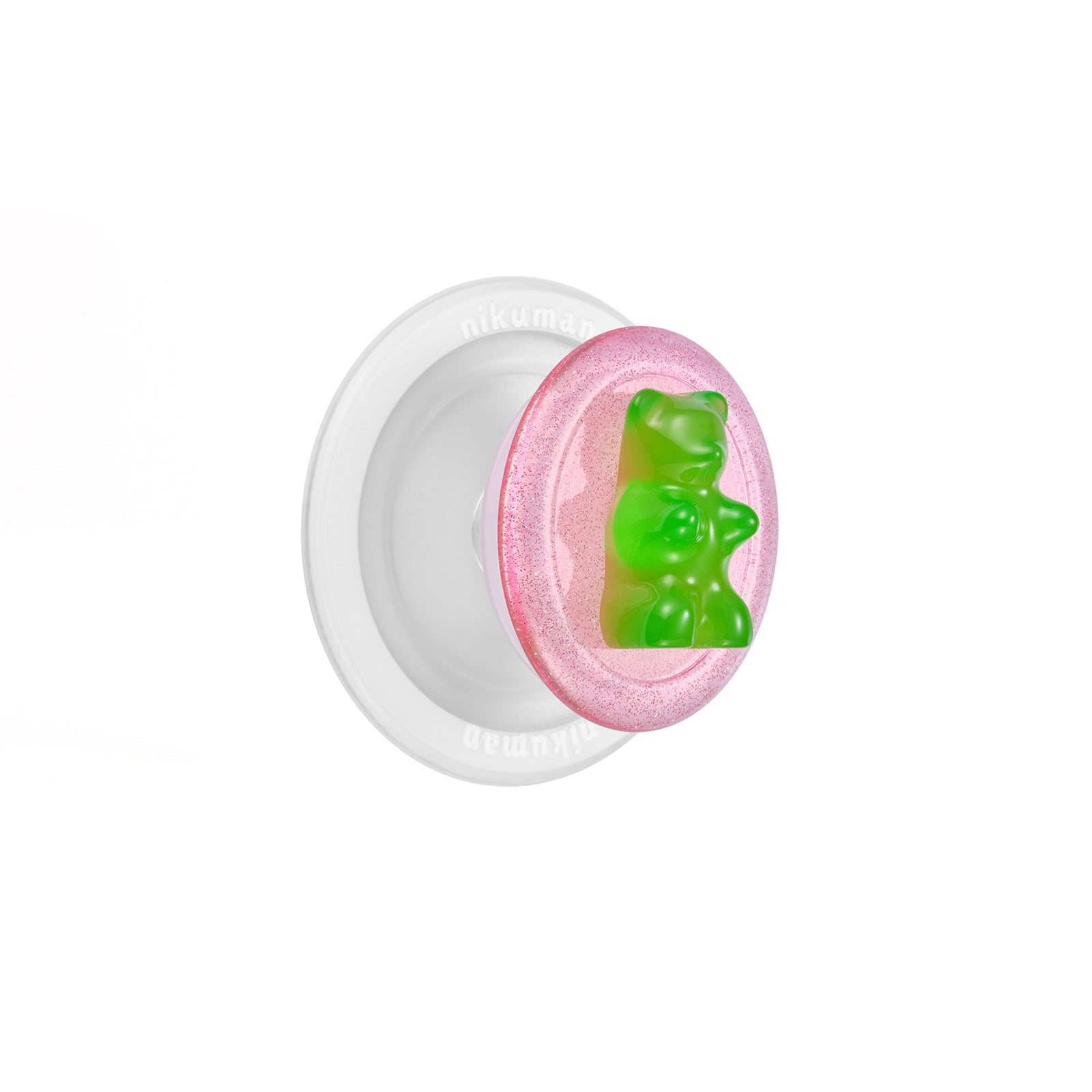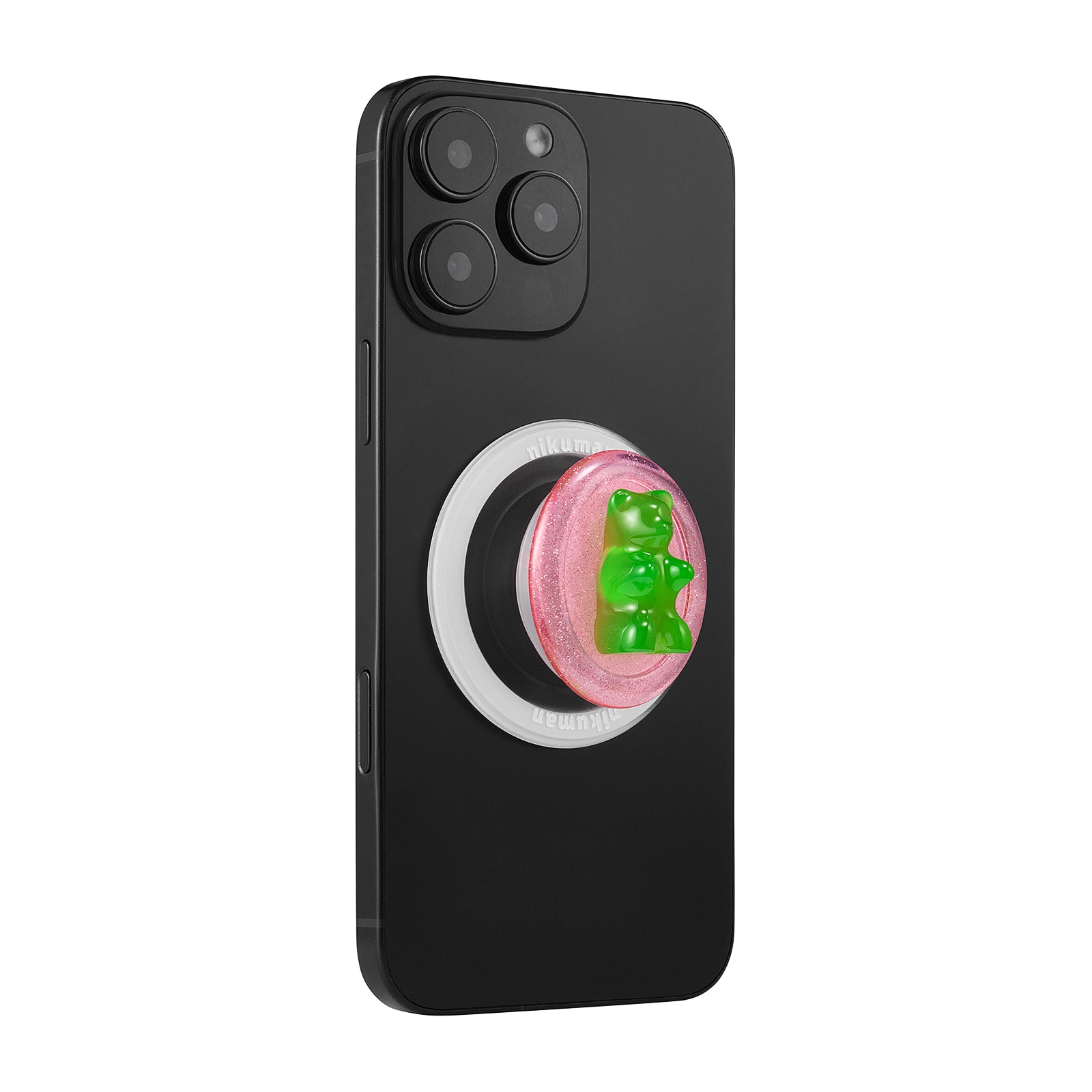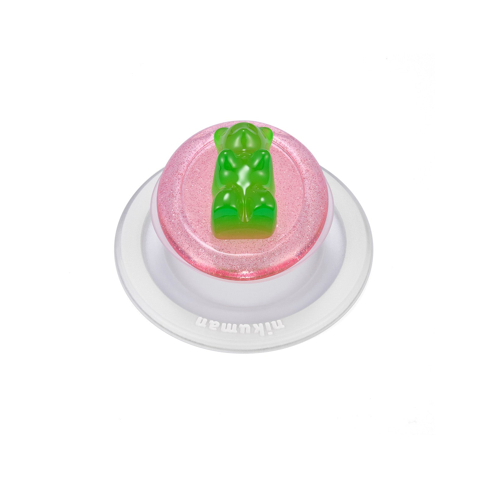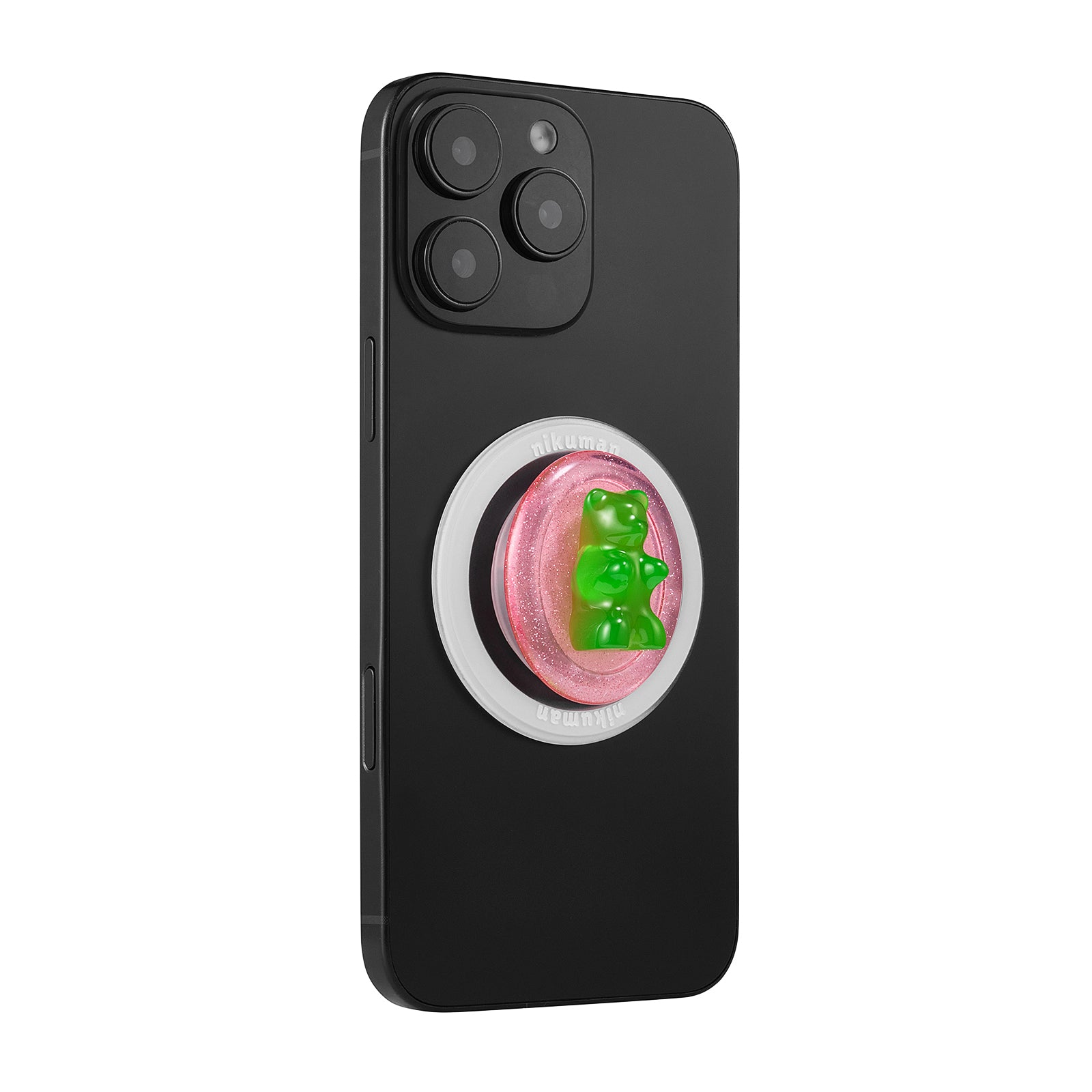 With the cool hue of a potion bottle and the cuteness of a candy shop, Minty Bear rests atop a pastel pink base. This green gummy friend is full of quirky charm, combining playful colors and a soft summer breeze vibe. Snap it on with Pull-to-Grip for a dose of sweet mischief in your hand.